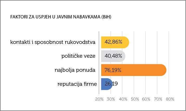 Monitoring was conducted using individual and aggregated findings of public sector auditing institutions, as well as information and tender documentation from current procurement procedures available on the Public Procurement Portal of BiH. Attitudes of the business community were explored using two research methods. The first is an innovative method, SenseMaker, which is suitable for research of complex situations, and this is its first application in the field of public procurement research. In addition to SenseMaker, a “classic” survey of business community representatives was conducted on their attitudes on public procurement in BiH.