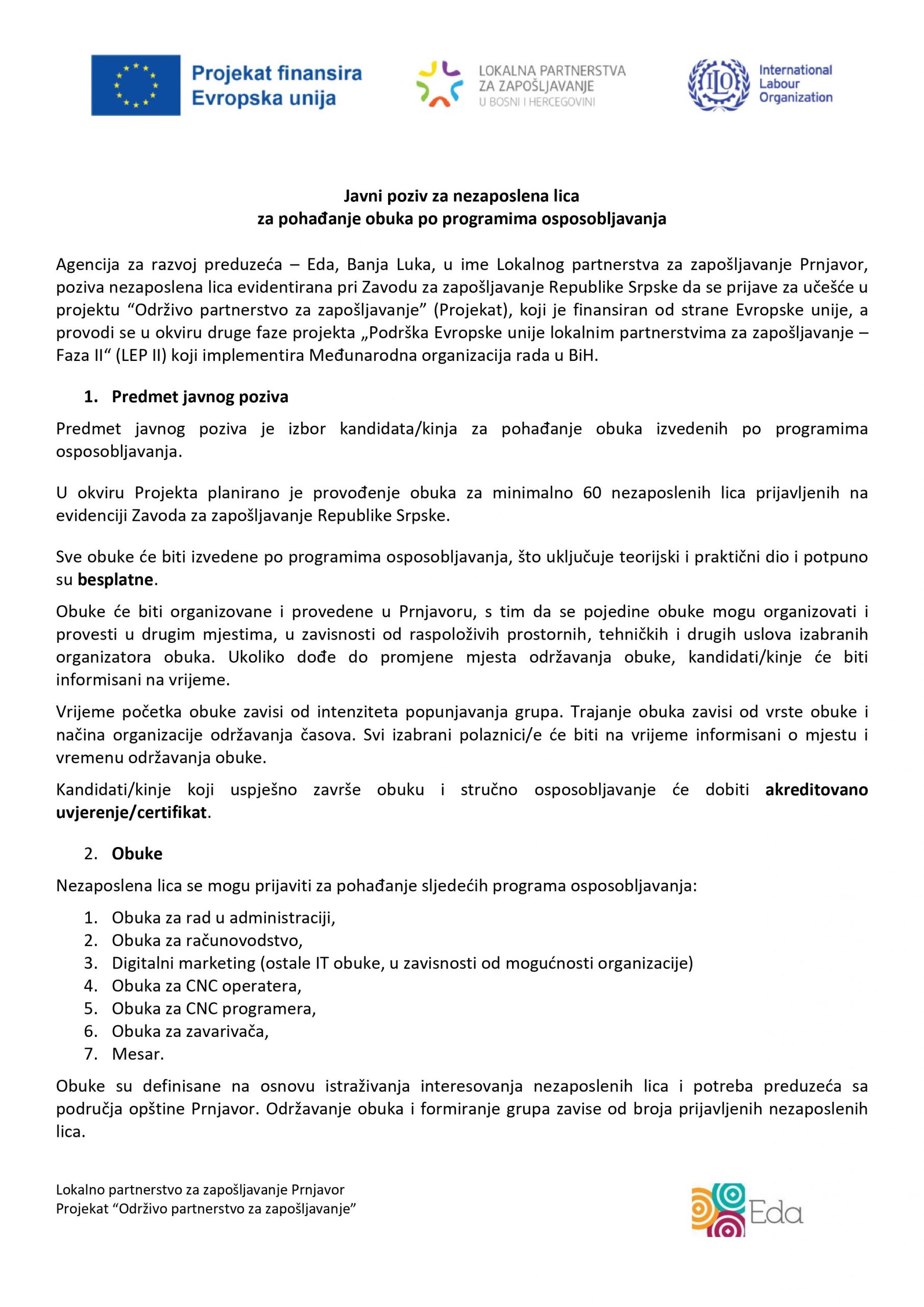 Eda – Enterprise Development Agency, Banja Luka, on behalf of the Local Partnership for Employment in Prnjavor, has published a public invitation for unemployed persons registered with the Employment Service of the Republic of Srpska, to attend free training programs. Unemployed persons can apply to attend the following training programs: