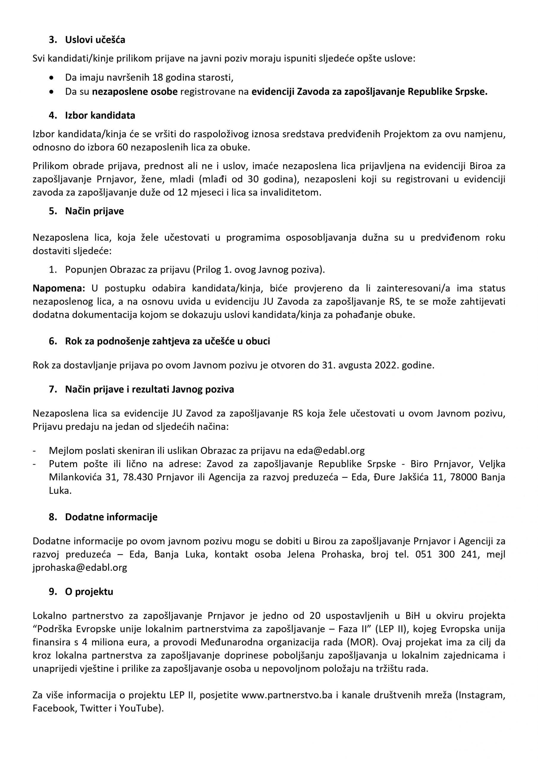Additional information can be obtained from the Employment Service of the Republic of Srpska – Prnjavor Office and the Eda – Enterprise Development Agency, Banja Luka (contact person Jelena Prohaska, phone number 051/300-241, email [email protected]).