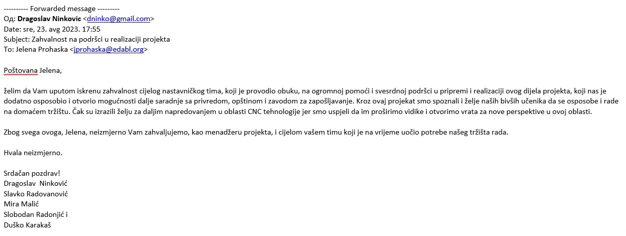 Today, we were pleasantly surprised by the letter we received from the representatives of the Center of Secondary Schools “Ivo Andrić” from Prnjavor, regarding the successfully conducted training program for wood CNC machine operators, which was realized within the framework of the project “EU Support to Local Employment Partnerships – Phase II” (LEP II).