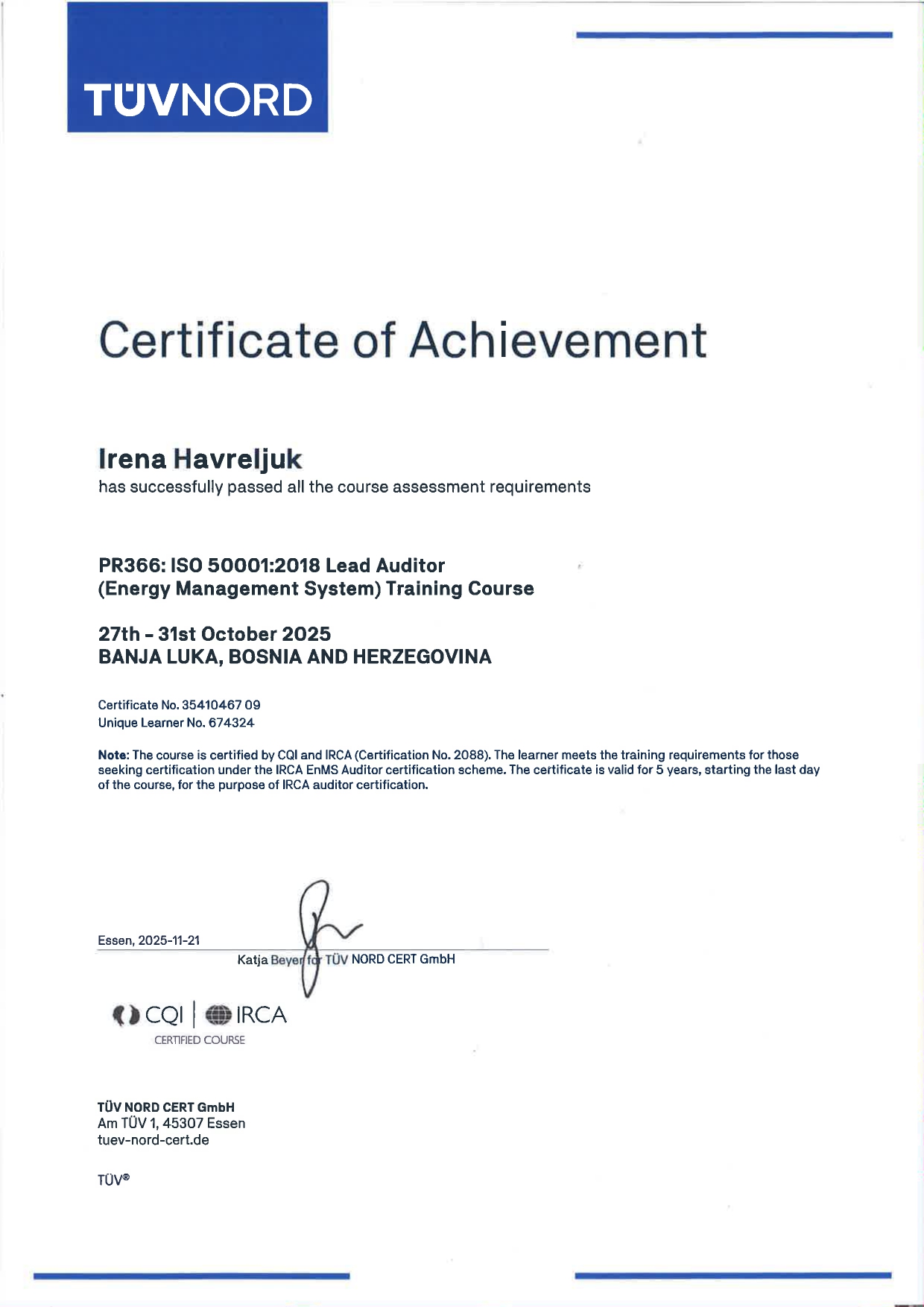 During the training, participants mastered methods for planning, establishing, implementing and improving energy management systems (EnMS) in line with the requirements of the ISO 50001:2018 standard, with a focus on reducing energy consumption, costs and CO₂ emissions. The course combined theoretical work with practical exercises, group tasks and audit simulations, and was led by an internationally accredited IRCA trainer, which further confirms the quality of the knowledge and skills acquired.