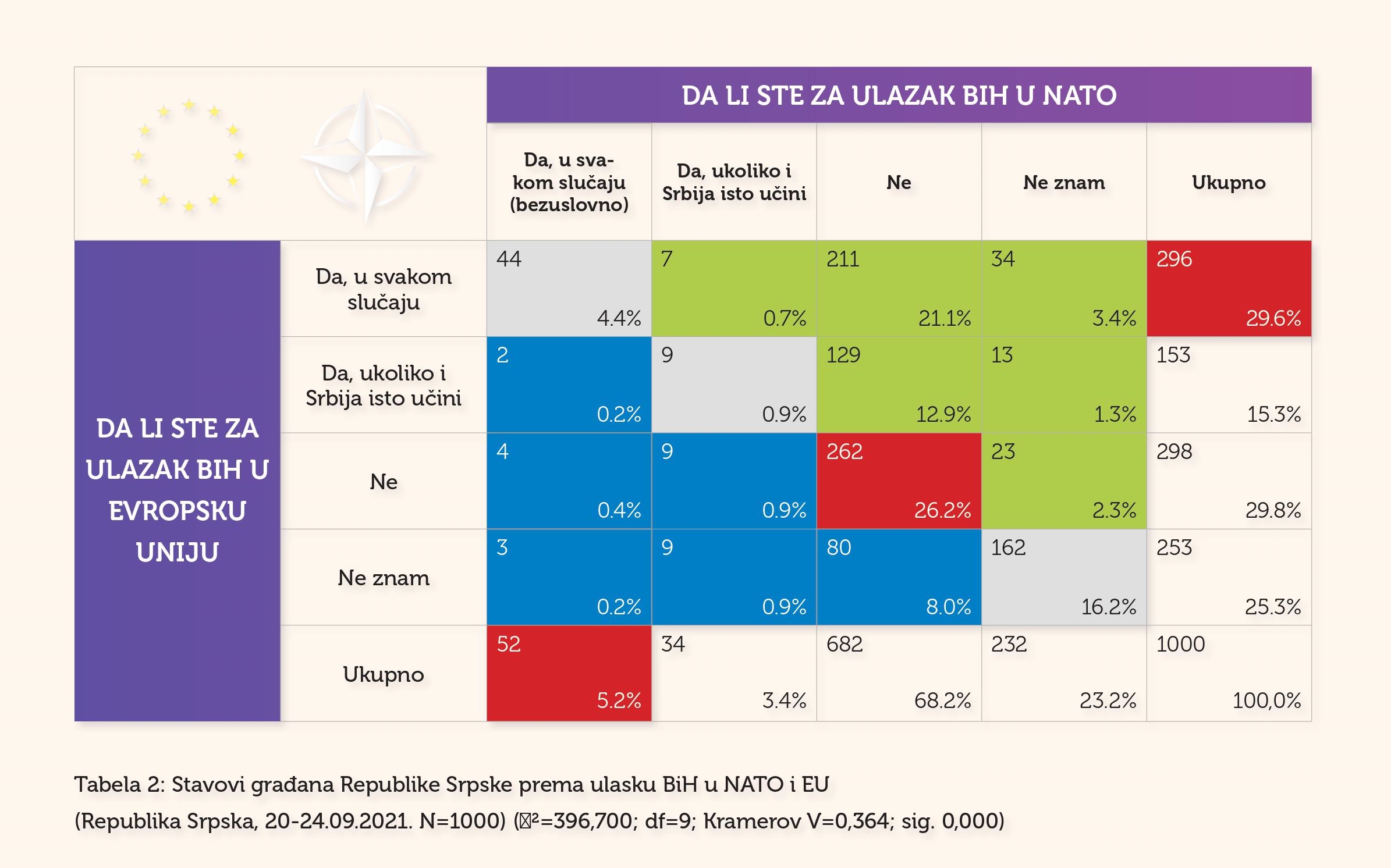 - Ulazak BiH u EU podržava 29,6% ispitanika, a ulazak u NATO 5,2% ispitanika;
