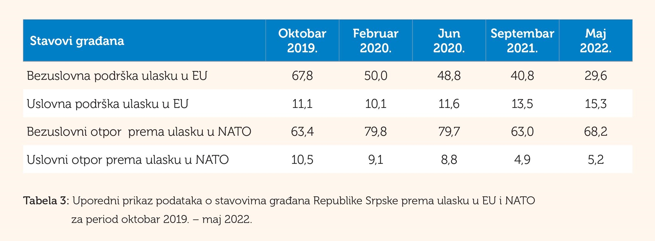 - U periodu od oktobra 2019. do danas, primjetan je konstantan pad bezuslovne podrške gra[1]đana Republike Srpske za ulazak u EU (od 67,8% do 29,6%);