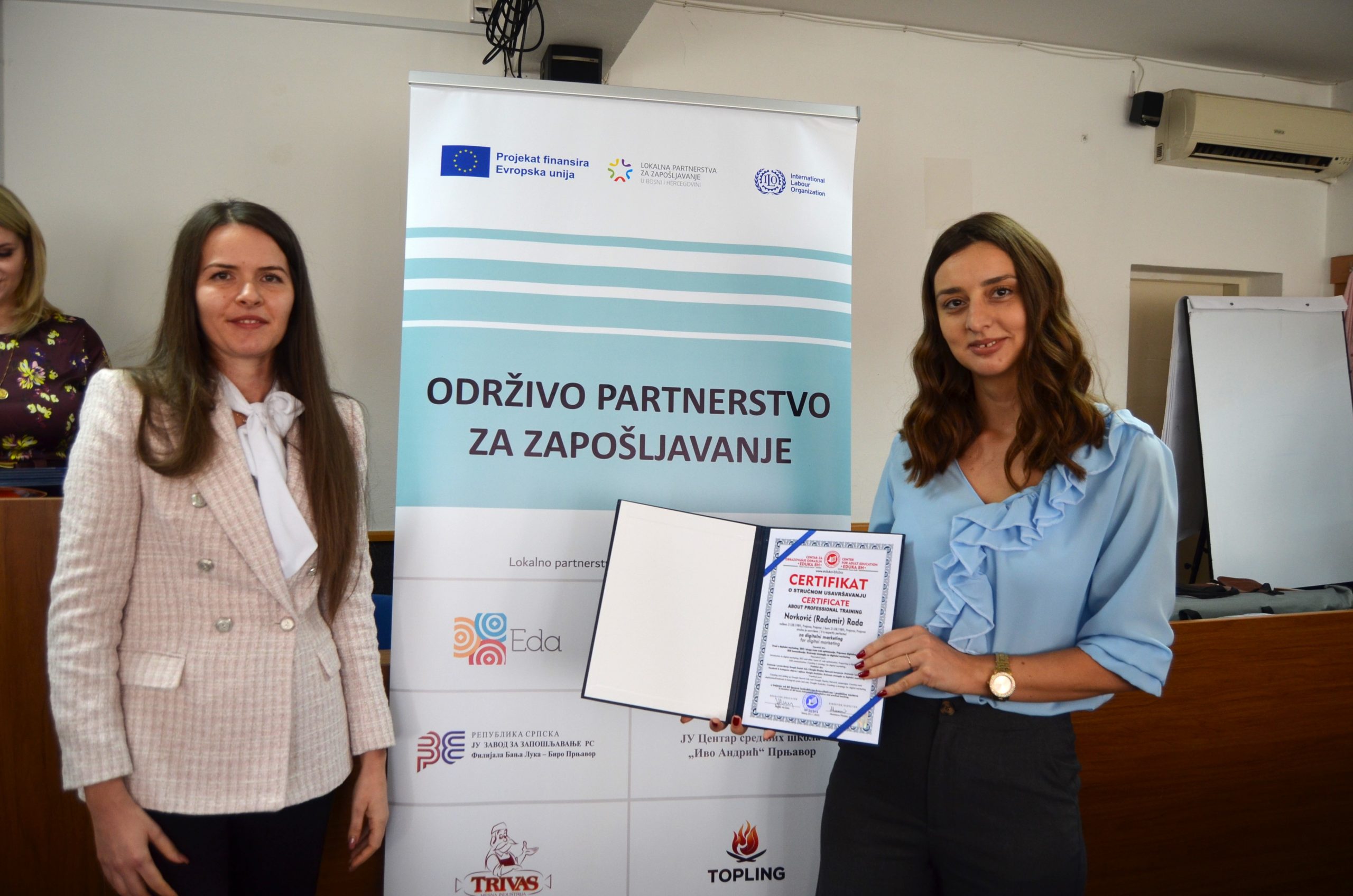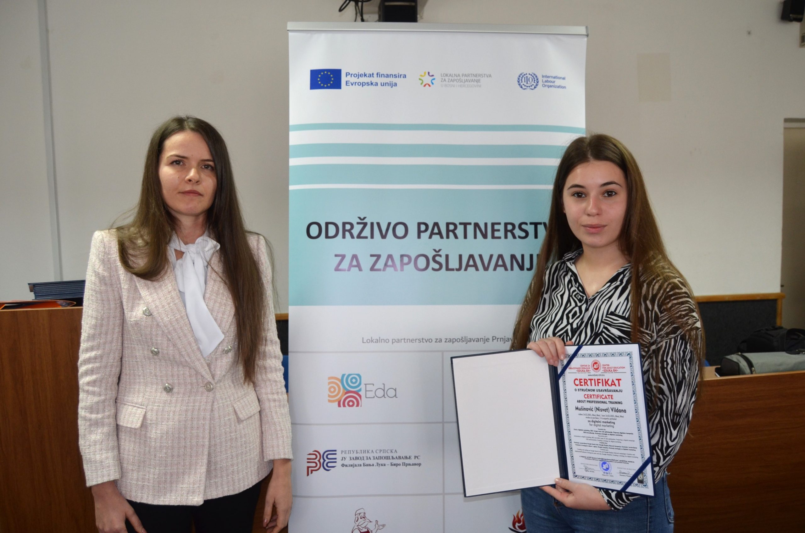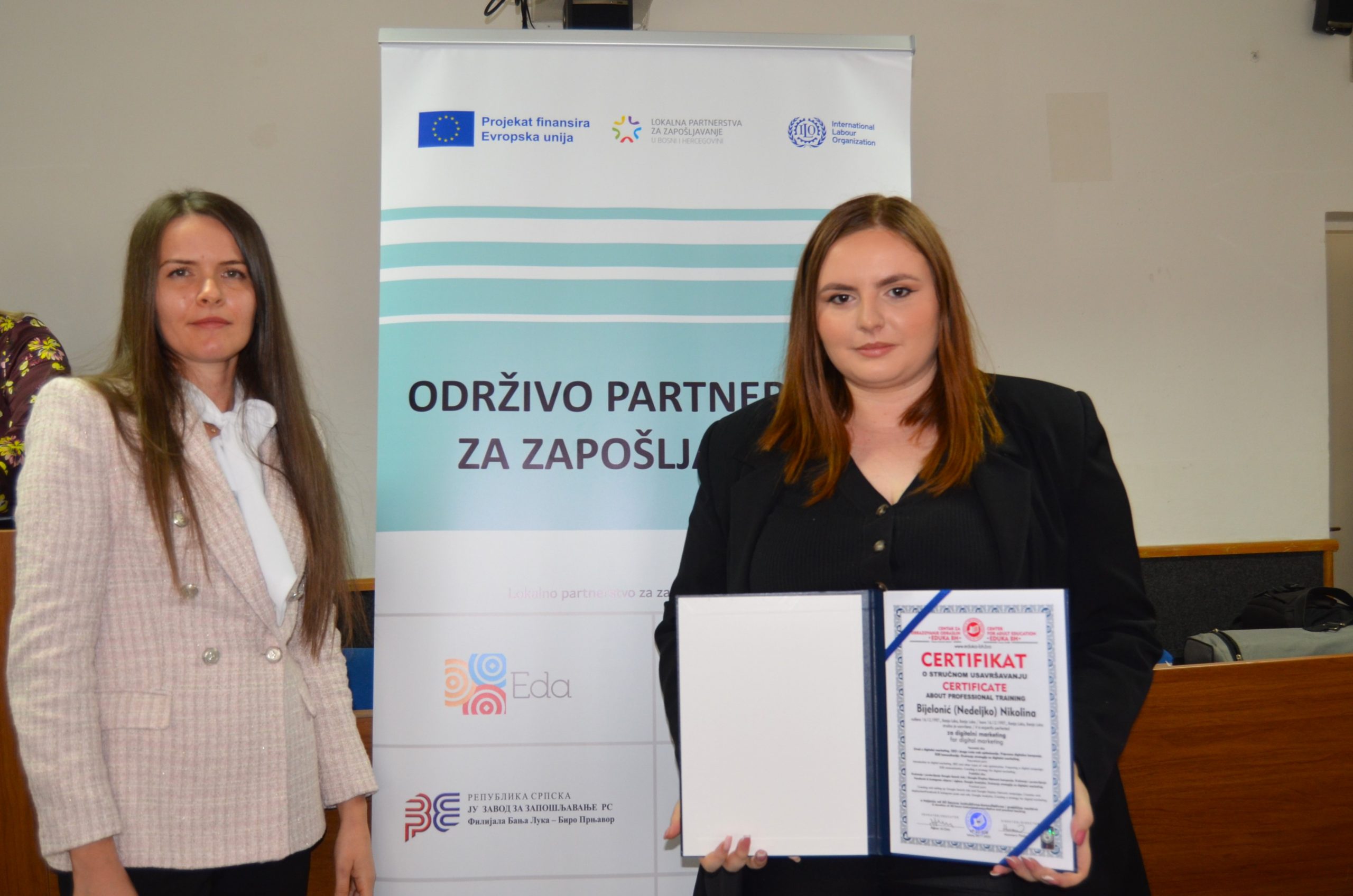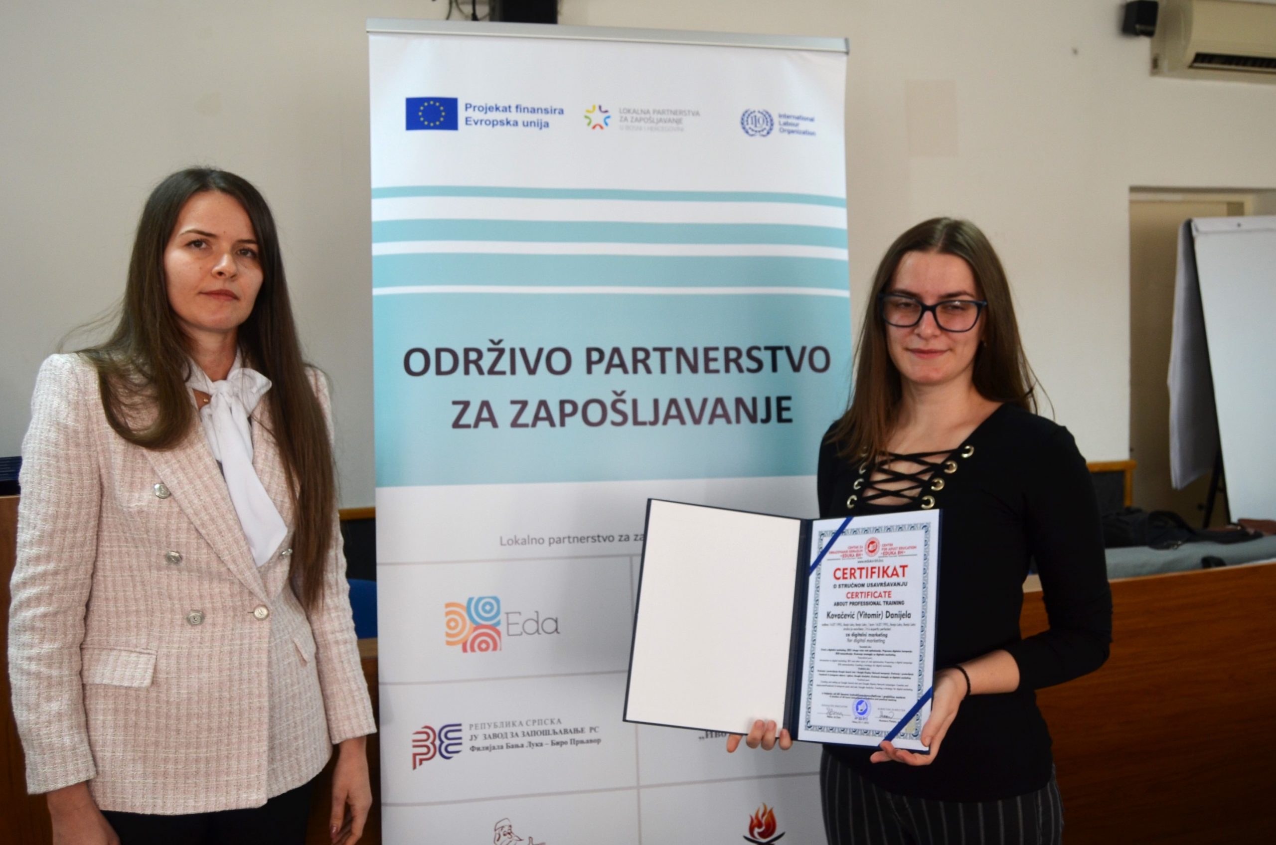 Danas su, u okviru projekta “Održivo partnerstvo za zapošljavanje”, dodijeljeni certifikati polaznicima obuke iz digitalnog marketinga. Svi polaznici obuke su nezaposlene osobe iz Prnjavora, evidentirane u Zavodu za zapošljavanje Republike Srpske.