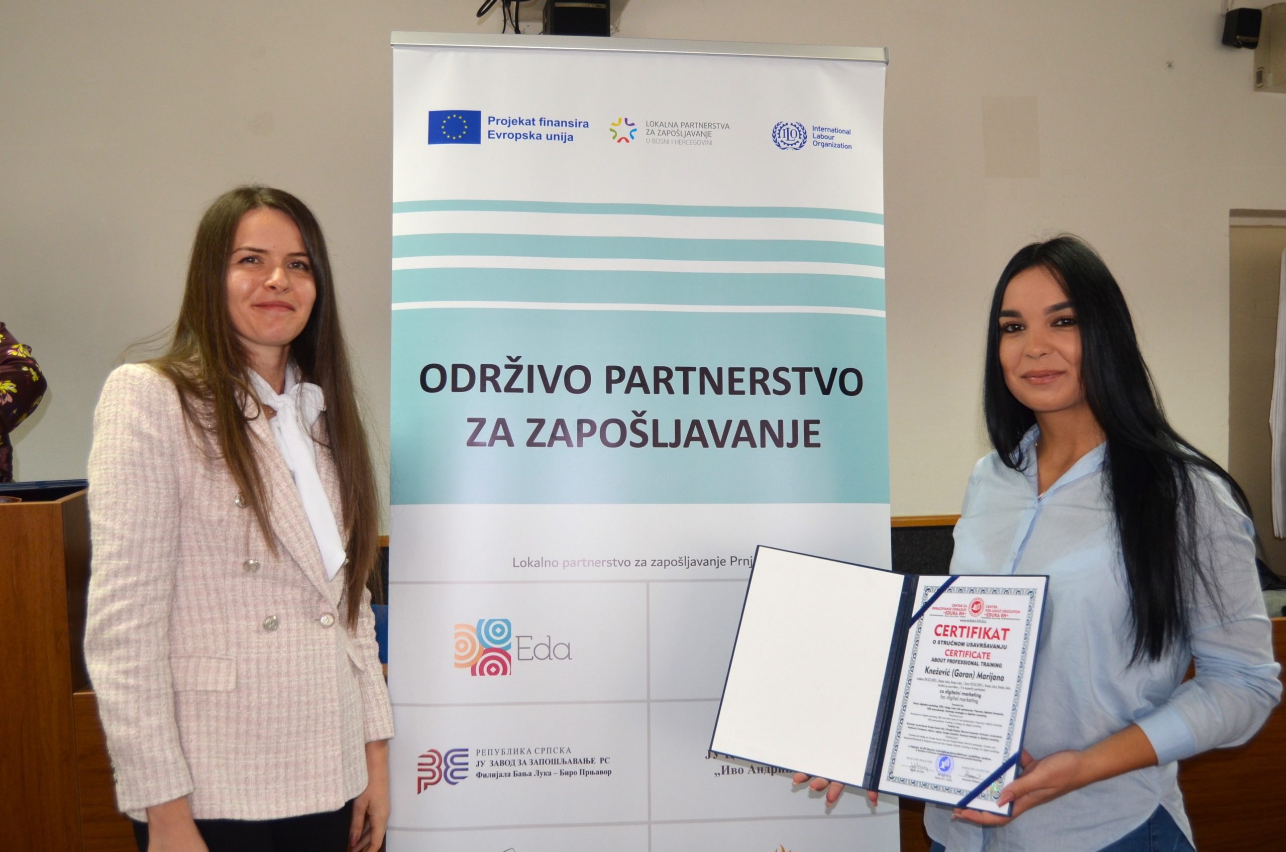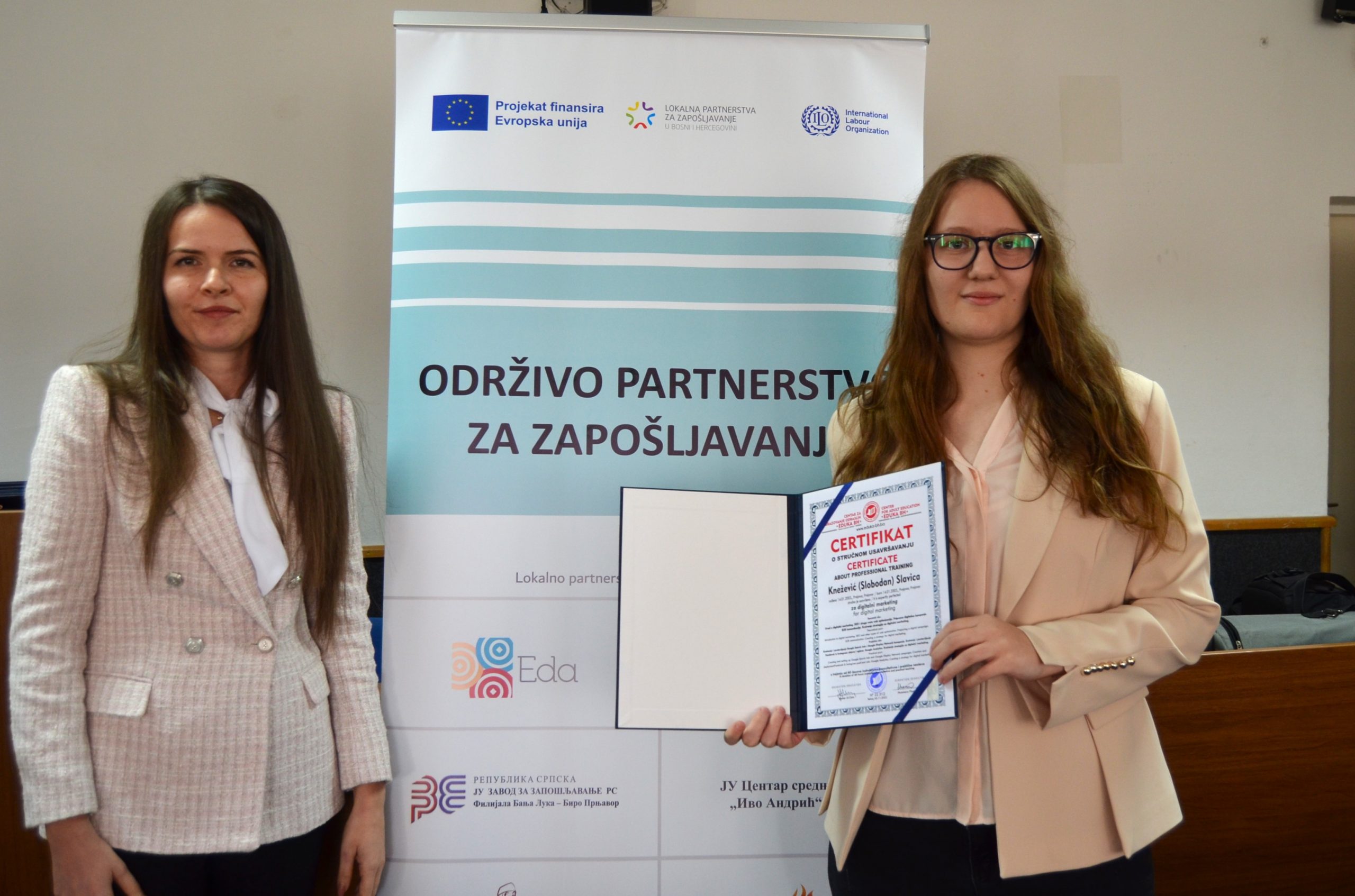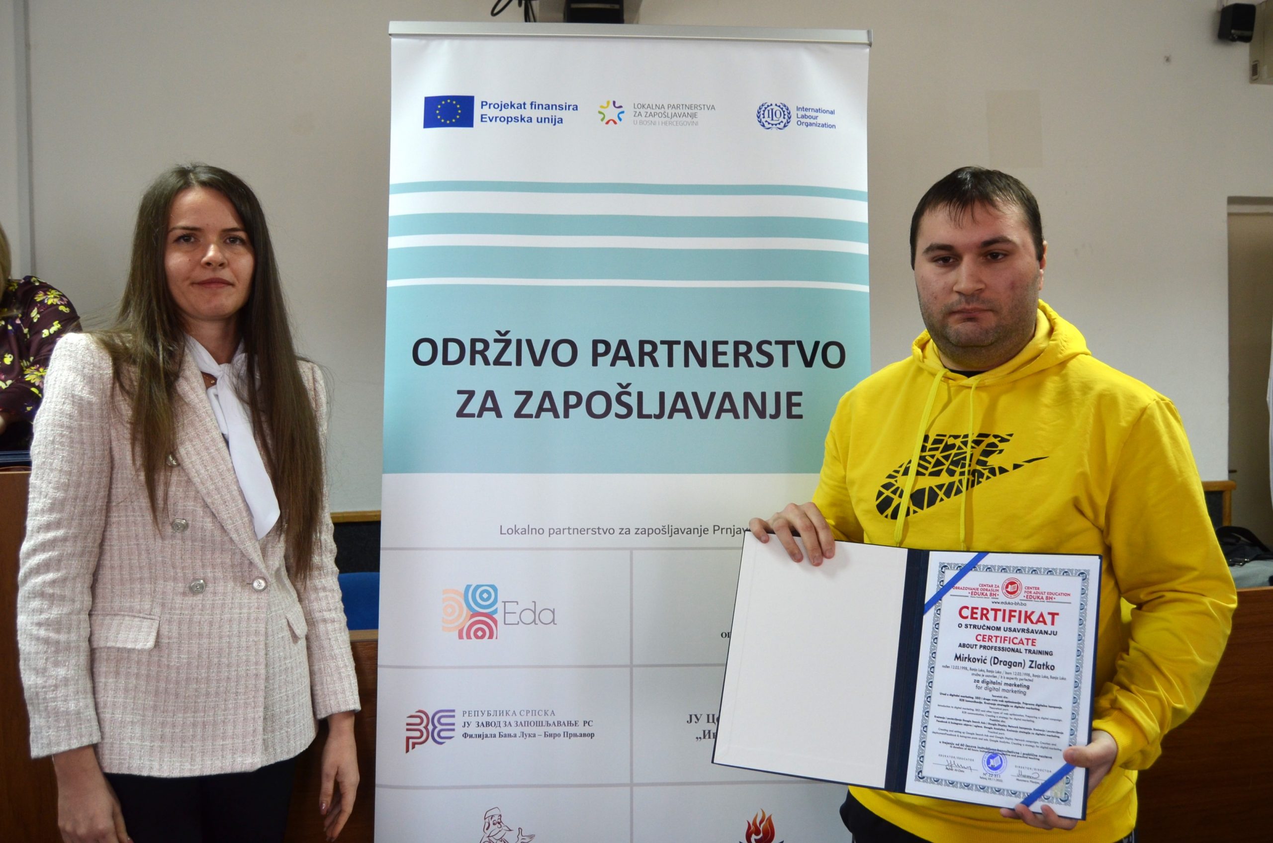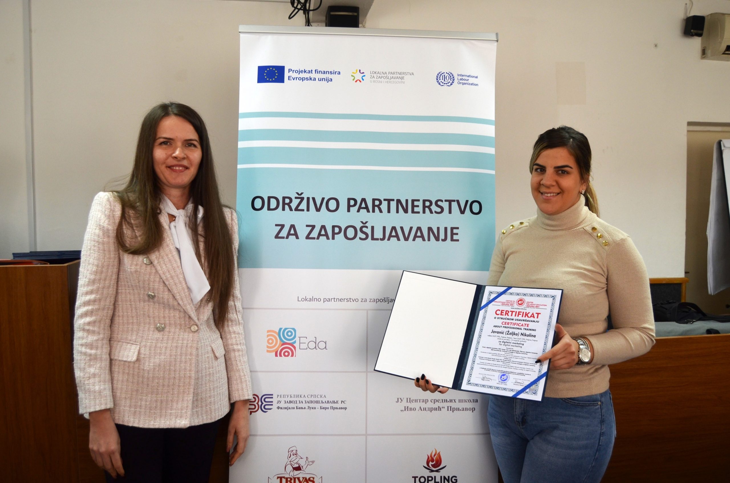 Danas su, u okviru projekta “Održivo partnerstvo za zapošljavanje”, dodijeljeni certifikati polaznicima obuke iz digitalnog marketinga. Svi polaznici obuke su nezaposlene osobe iz Prnjavora, evidentirane u Zavodu za zapošljavanje Republike Srpske.