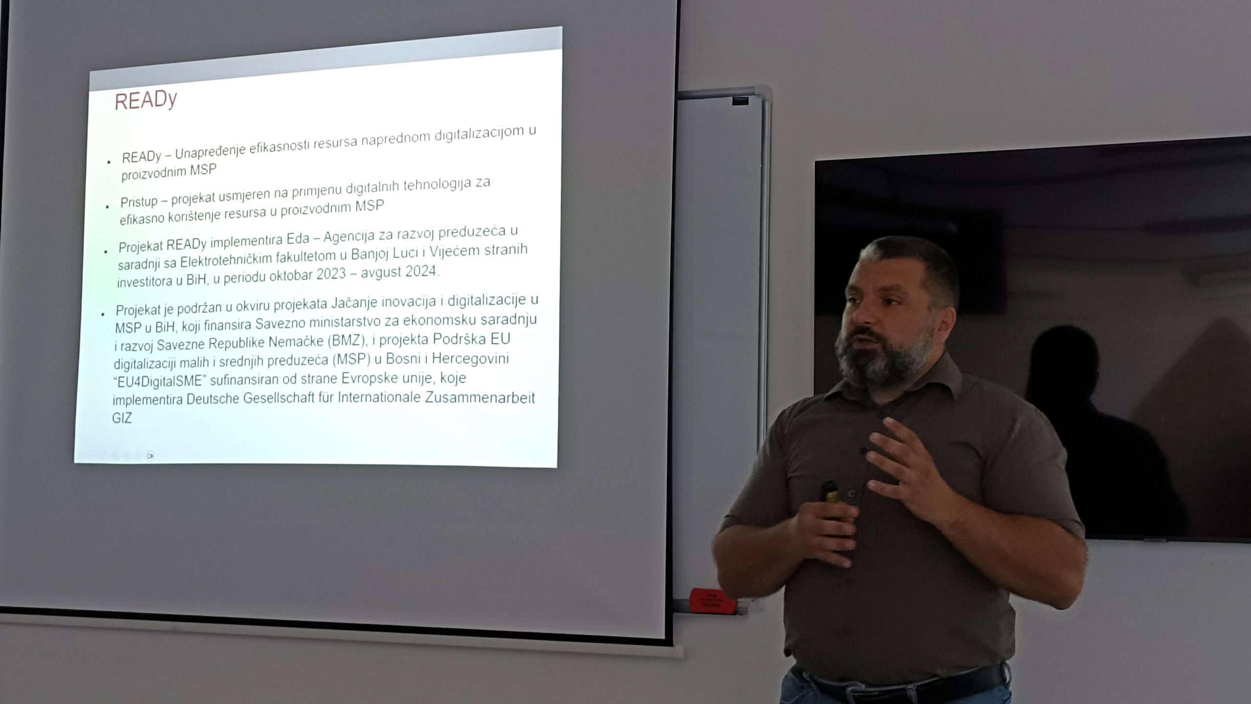 Radionica je organizovana u okviru projekta READy – Unapređenje efikasnosti resursa naprednom digitalizacijom u proizvodnim MSP“, koji implementira Agencija za razvoj preduzeća Eda u partnerstvu sa Elektrotehničkim fakultetom Univerziteta u Banjoj Luci i Savjetom stranih investitora, a koji je podržan u okviru projekta „Inovacije i digitalizacija malih i srednjih preduzeća u Bosni i Hercegovini/EU4DigitalSME“ kojeg sufinansiraju Evropska unija i Savezno ministarstvo za ekonomsku saradnju i razvoj Savezne Republike Njemačke (BMZ), a implementira Deutsche Gesellschaft für Internationale Zusammenarbeit (GIZ) GmbH. Više informacija o projektu READy možete pronaći ovdje.